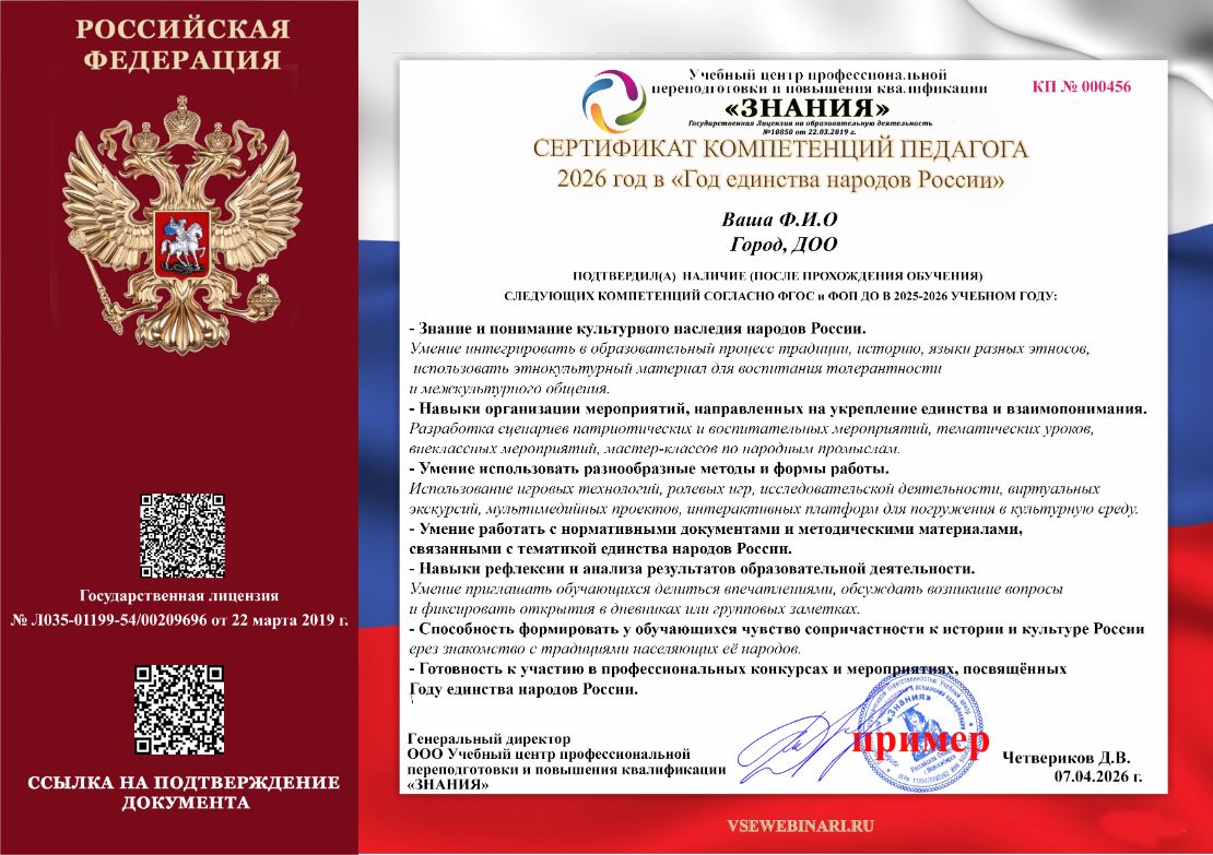 СЕРТИФИКАТ КОМПЕТЕНЦИЙ ПЕДАГОГА 2026 год в «Год единства народов России»