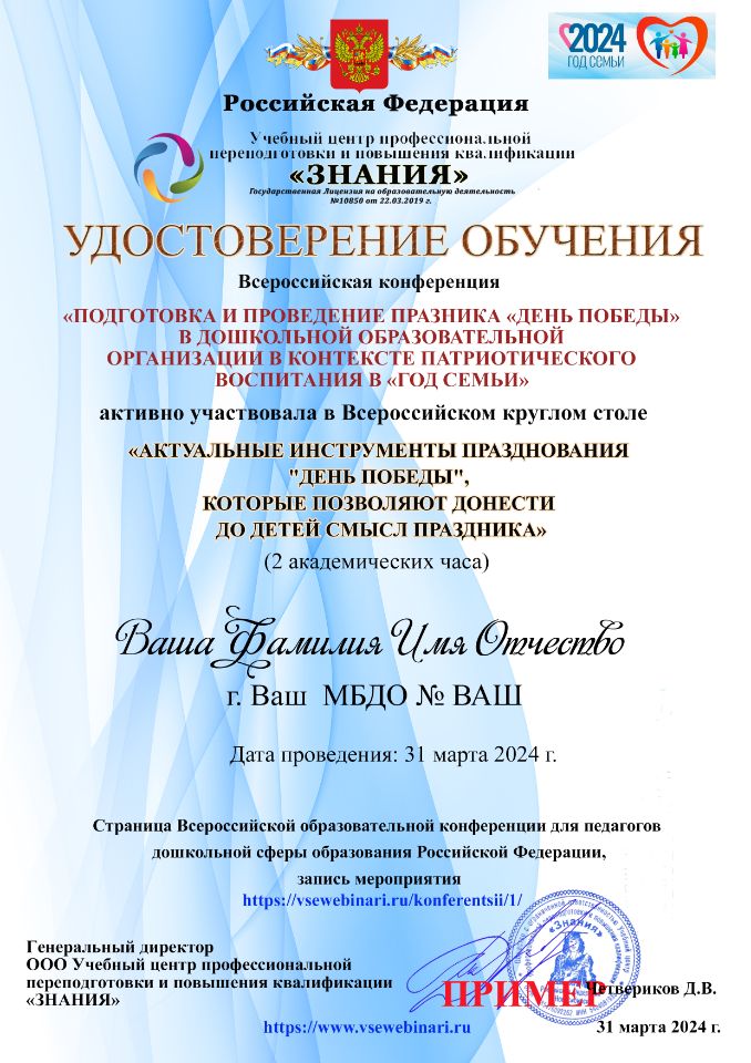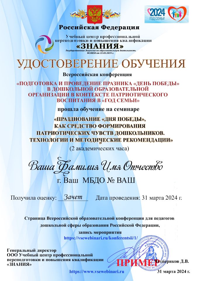 4.Удостоверение обучения на семинаре «ПРАЗДНОВАНИЕ "ДНЯ ПОБЕДЫ", КАК СРЕДСТВО ФОРМИРОВАНИЯ ПАТРИОТИЧЕСКИХ ЧУВСТВ ДОШКОЛЬНИКОВ. ТЕХНОЛОГИИ И МЕТОДИЧЕСКИЕ РЕКОМЕНДАЦИИ»
